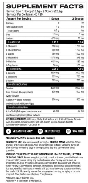 Keep yourself strong and hydrated during a tough workout — with Ghost Amino V2! Packed with 10g of total essential amino acids per serving, plus added hydration and Astragin® for absorption, this vegan-friendly supplement ist the most complete amino acid based product on the market. This formula also contains a complex of taurine as well as organic raw coconut water and Aquamin™ to keep you hydrated during your gym session or exercise. Say bye-bye to sugary sports drinks or juices — Ghost Amino V2 is your new healthy performance alternative!