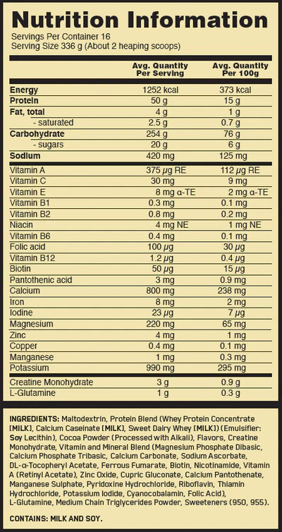 Some people would give anything to have a fast metabolism, but for you, as a weight lifter, it is stopping you from reaching your goals? Putting on quality weight isn’t as simple as consuming a massive load of fast-food every day. If you think you're ready for the ultimate bulk season, consider Optimum Nutrition Serious Mass! Optimum Nutrition Serious Mass is for those who want a delicious, high-protein weight gain powder to maximise their workout. This powerhouse contains 1250 calories from 50 g of protein and more than 250 grams of carbohydrates – everything you need to build big muscle. This formula is so sophisticated that it didn’t need sugar at all to make it perfect. Instead, creatine and glutamine, as well as 25 minerals and vitamins, have been added. Each serving contains high-value protein, including Whey Protein Concentrate, Calcium Caseinate, Egg Albumen and Sweet Dairy Whey to boost your muscle growth as well as your performance.