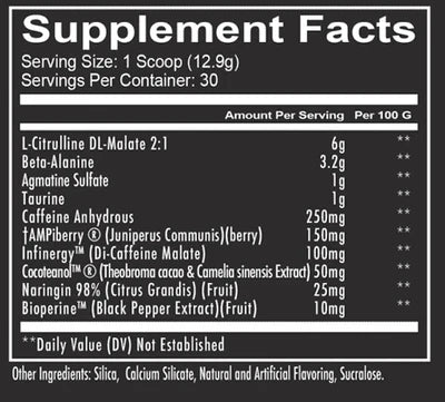 - Pump Matrix – A blend of Citrulline Malate and Agmatine Sulphate to increase nitric oxide levels, improving nutrient delivery to muscles and creating the ‘pump’ effect.
